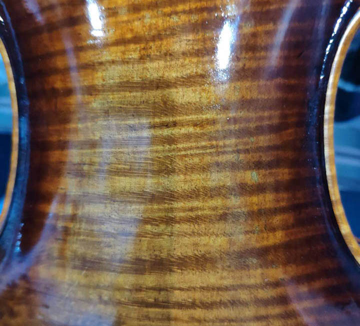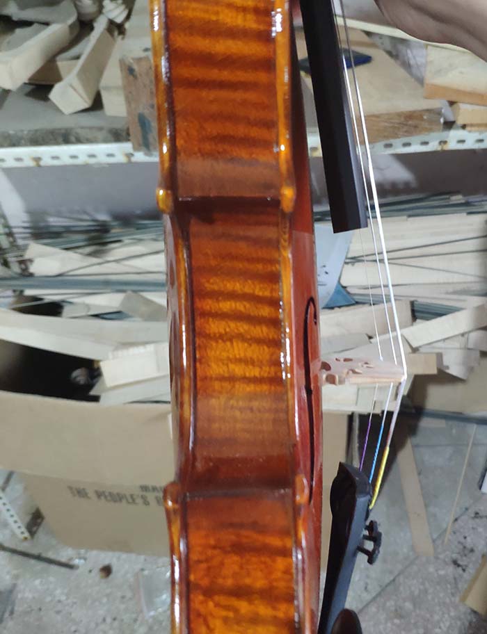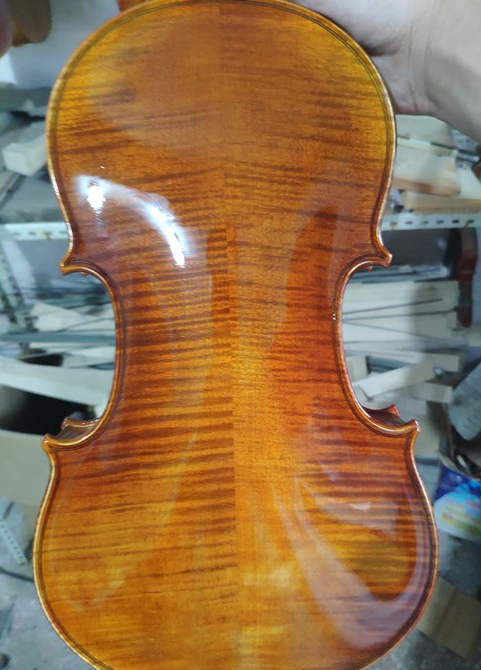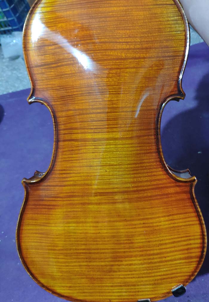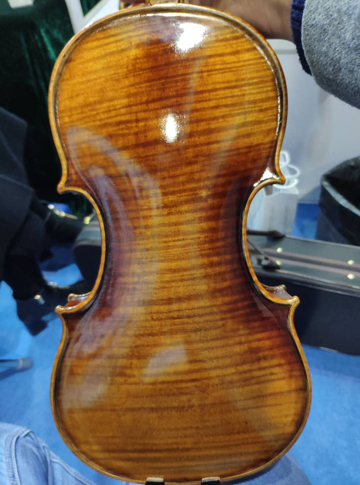 描述:這把琴是今年五月份在去北京小提琴展會之前做的,琴的聲音和外觀都比較不錯。琴的面板木紋的距離在1.2-1.5毫米左右,背板花紋錯落有致,整體油漆的顏色比較平均,風(fēng)格算是比較中規(guī)中矩的。聲音婉轉(zhuǎn)悠揚,共振好,容易控制。