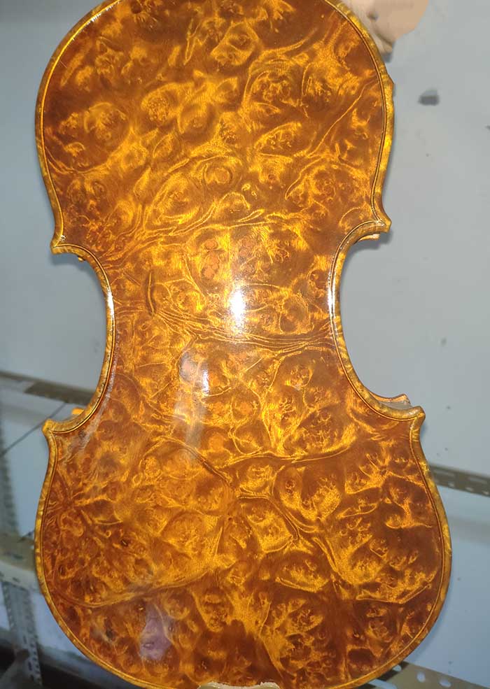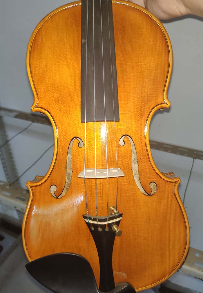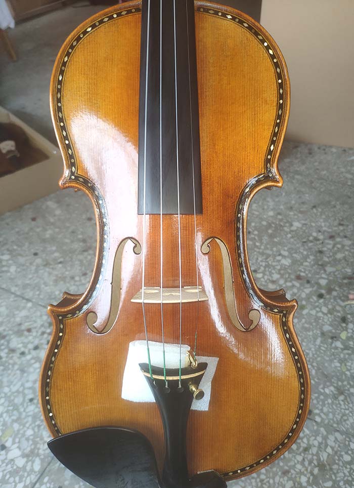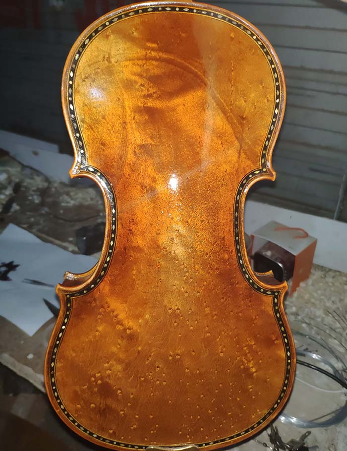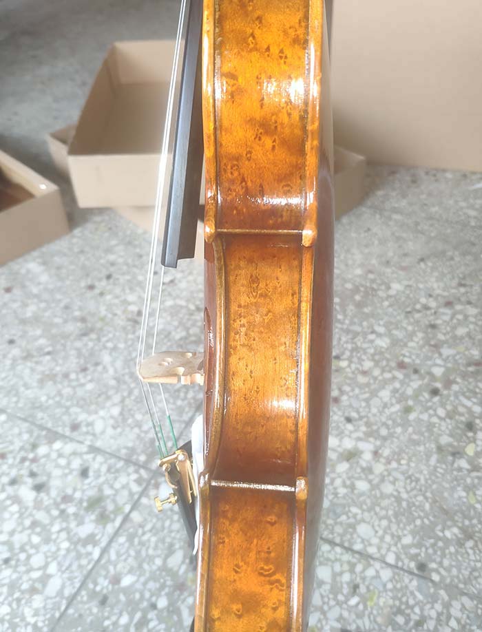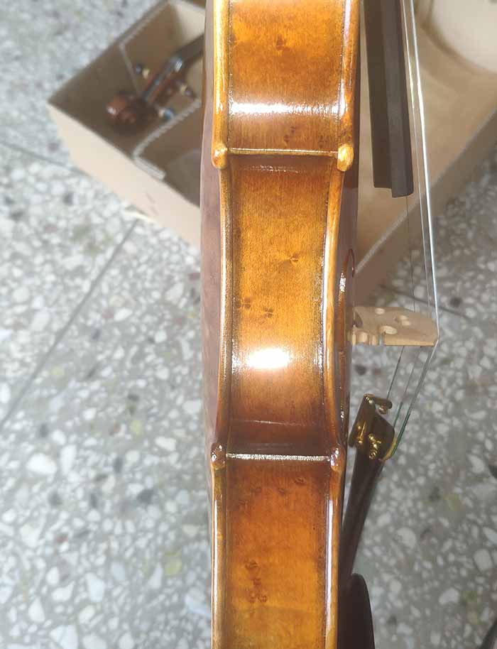 描述:背板是意大利的雀眼花紋的楓木,雀眼并不算很多,面板木質均勻,木紋的平均寬度在2.5毫米左右。油漆采用仿舊風格,顏色有深有淺,質感非常好。這把琴的聲音比較清晰干脆,婉轉悠揚,非常適合專業演奏和練習使用,更是當做禮物來贈送的不二之選。