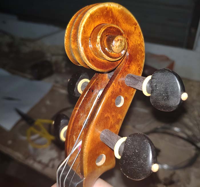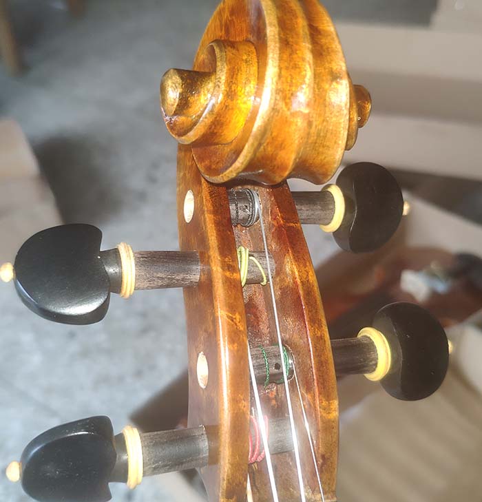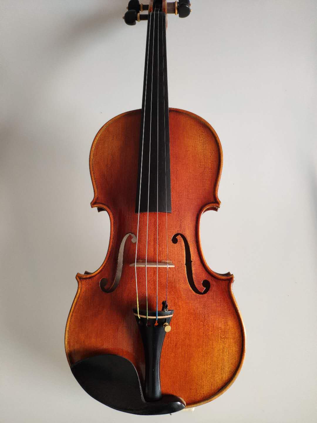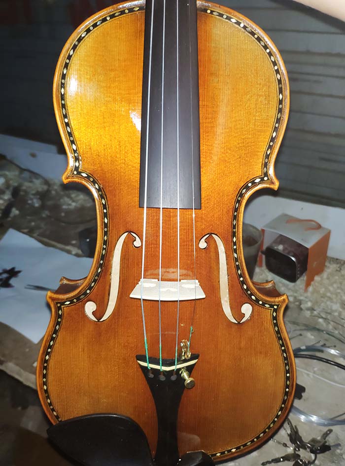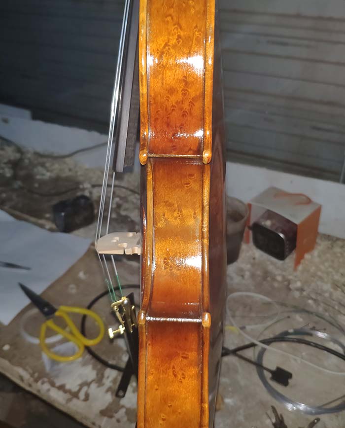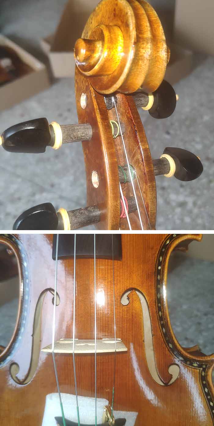 描述:背板是意大利的雀眼花紋的楓木,雀眼并不算很多,面板木質均勻,木紋的平均寬度在2.5毫米左右。油漆采用仿舊風格,顏色有深有淺,質感非常好。這把琴的聲音比較清晰干脆,婉轉悠揚,非常適合專業演奏和練習使用,更是當做禮物來贈送的不二之選。