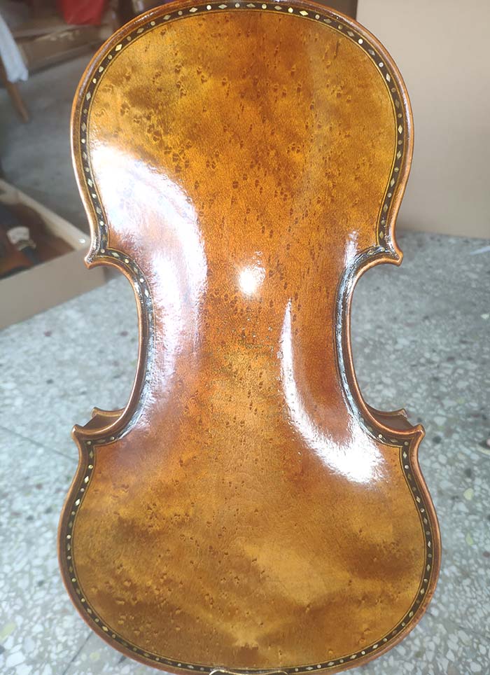 描述:一把非常漂亮的歐洲雀眼楓小提琴,面板采用的瑞士云杉木,背板采用的是歐洲雀眼楓木,雀眼非常多的那種。邊沿位置采用了貝殼鑲嵌,可以說是錦上添花、盡顯奢華。在音質方面,我只能用溫文爾雅、玩轉多變來形容,因為這把琴聲音確實非常棒。
