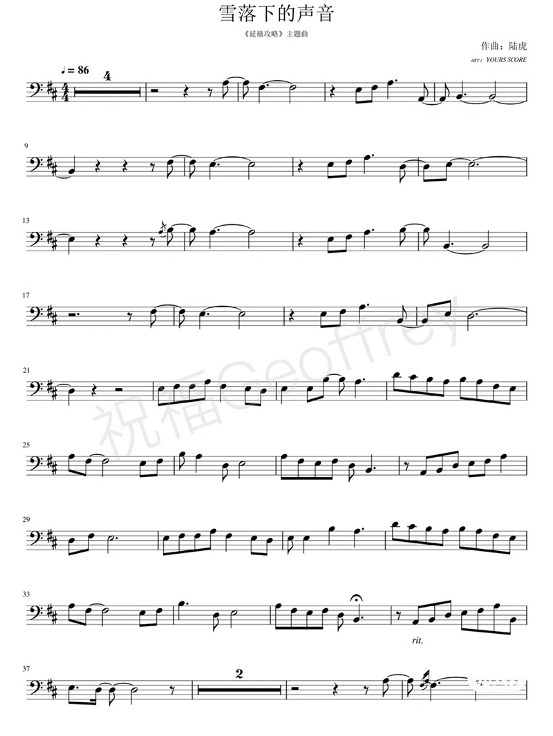 《延禧攻略》雪落下的聲音-大提琴譜 http://m.hzbip.com/4178.html http://m.hzbip.com/4178.html#respond Thu, 06 Apr 2023 17:53:23 +0000 http://m.hzbip.com/?p=4178 這首大提琴曲叫《雪落下的聲音》,是改編自內地電視劇《延禧攻略》的插曲以及片尾曲,這首歌由于正作詞,由陸虎作曲并演唱,這首歌曲獲得了2019年愛奇藝尖叫之夜的年度金曲獎。今天我們就將這首簡單有好聽的大提琴版《雪落下的聲音》分享給大家,這里只有大提琴譜,想聽的話可以關注我們“小提琴屋”公眾號。